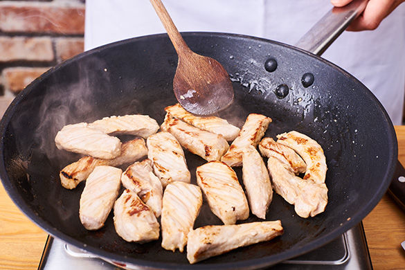 Das Fleisch in einer mittelgroßen Pfanne mit 1EL Öl bei starker Hitze 1–2Min. scharf anbraten. Mit der restlichen Teriyakisauce ablöschen. Die Pfanne vom Herd nehmen und beiseitestellen.