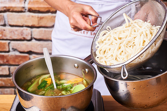 In einem mittelgroßen Topf ausreichend Wasser zum Kochen bringen. Die 1/2 der Udon-Nudeln darin in ca. 4Min. bissfest kochen. Durch ein Sieb abgießen und abtropfen lassen.