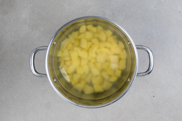 Den Backofen auf 220°C (200°C Umluft) vorheizen. Die Kartoffeln schälen, in ca. 2cm große Würfel schneiden, dann in einem großen Topf mit ausreichend gesalzenem Wasser zum Kochen bringen und in 8–10Min. gar kochen. In ein Sieb abgießen, dabei ca. 1 Tasse Kochwasser auffangen.
