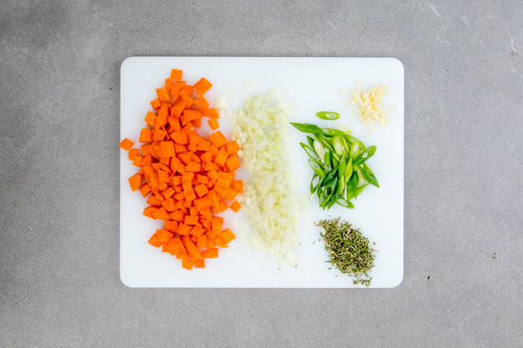 Die Karotten ggf. schälen, längs vierteln und in ca. 1cm breite Stücke schneiden. Die Zwiebeln schälen, halbieren und in feine Würfel schneiden. Die Lauchzwiebeln schräg in feine Ringe schneiden. Den Knoblauch schälen und fein würfeln. Die Rosmarinnadeln von den Stängeln zupfen und fein schneiden.