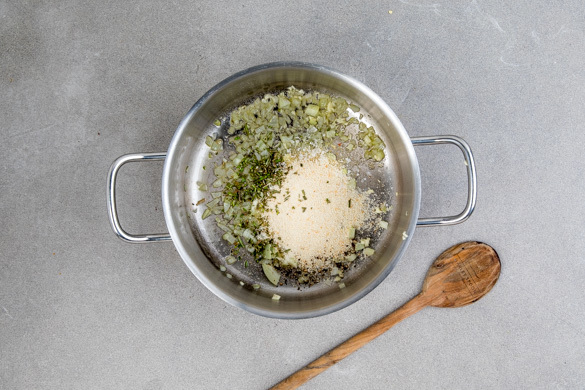 Die 1/2 der Zwiebeln und den Knoblauch mit 2EL Olivenöl in einem kleinen Topf bei mittlerer Hitze 1–2Min. farblos anschwitzen. Den Rosmarin und die Semmelbrösel dazugeben und kurz anbraten. Mit Salz und Pfeffer abschmecken.