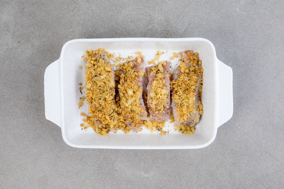 Den Fisch mit kaltem Wasser abspülen, trocken tupfen, evtl. vorhandene Gräten mit einer Pinzette entfernen und in 6–8 gleich große Stücke schneiden. Den Fisch mit je 1 kräftigen Prise Salz und Pfeffer würzen, in eine Auflaufform geben und die Bröselmasse darauf verteilen, dann im Ofen ca. 15Min. goldbraun backen.