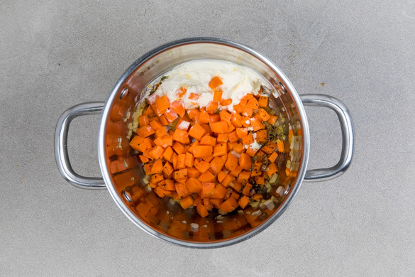 Die restlichen Zwiebeln und die Karotten in einem mittelgroßen Topf mit 1EL Olivenöl bei mittlerer Hitze 2–3Min. anbraten. Mit je 1 kräftigen Prise Salz und Pfeffer würzen, dann das Gemüse mit 200ml Wasser ablöschen und einköcheln lassen, bis das Wasser verdampft ist. Ca. 2/3 der Crème fraîche unterrühren, das Gemüse vom Herd nehmen und erneut abschmecken.