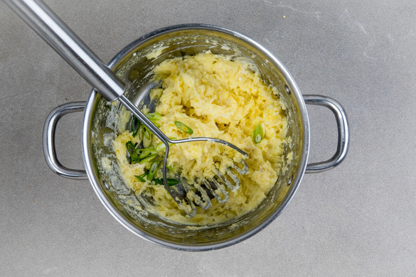 Den Backofen auf 220°C (200°C Umluft) vorheizen. Die Kartoffeln schälen, in ca. 2cm große Würfel schneiden, dann in einem mittelgroßen Topf mit ausreichend gesalzenem Wasser zum Kochen bringen und in 8–10Min. gar kochen. In ein Sieb abgießen, dabei ca. 1 Tasse Kochwasser auffangen.