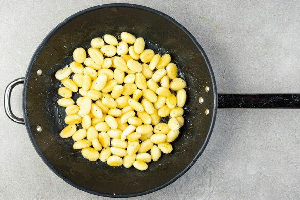Die Gnocchi in einer großen Pfanne mit 2EL Olivenöl bei mittlerer bis starker Hitze 6–8Min. braten, dabei gelegentlich umrühren. Die Hitze reduzieren, falls die Gnocchi zu dunkel werden.