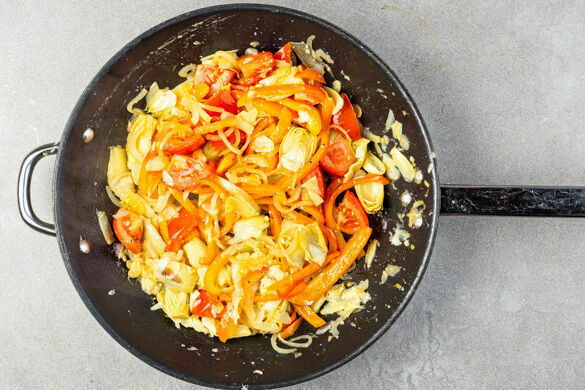 Die Zwiebeln und den Knoblauch in einer zweiten großen Pfanne mit 2EL Olivenöl bei mittlerer Hitze ca. 2Min. anbraten, dann die Artischocken, die Tomaten und die Paprika zugeben und 4–5Min. weich braten.