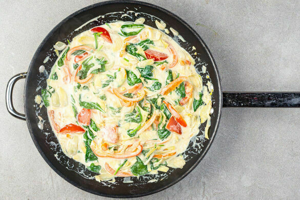 Den Spinat mit der Sojasahne, dem Brühgewürz, 200ml Wasser sowie je 1 Prise Salz und Pfeffer zu dem Gemüse in die Pfanne geben und 3–4Min. einköcheln lassen.
