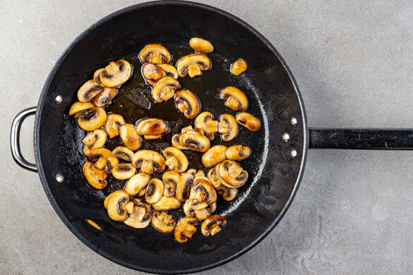 In einem mittelgroßen Topf ausreichend gesalzenes Wasser für die Pasta zum Kochen bringen. 3EL Butter in einer großen Pfanne bei niedriger Hitze schmelzen, dann die Pilze zugeben und bei mittlerer Hitze in 6–8Min. goldbraun und weich braten.