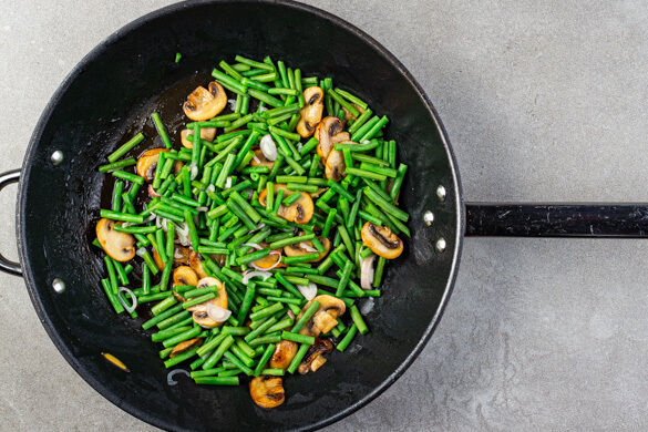 Die Bohnen in Drittel schneiden, dabei die Enden abtrennen. Die Bohnen mit den Schalotten, 1EL Zitronensaft und 1EL Butter zu den übrigen Pilzen in die Pfanne geben und bei mittlerer Hitze 5–6Min. braten, bis sie bissfest und die Schalotten glasig sind. Mit Salz und Pfeffer abschmecken.