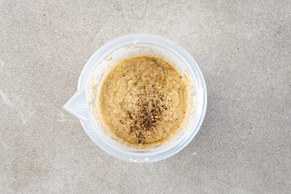 Die 1/2 des Trüffelöls mit 50ml Pastawasser in das Gefäß zu den Pilzen geben und mit einem Stabmixer fein pürieren. Je nach gewünschter Konsistenz ggf. esslöffelweise mehr Pastawasser zugeben, bis die Sauce cremig ist, dann mit Salz und Pfeffer abschmecken.