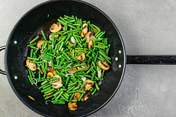 Die Bohnen in Drittel schneiden, dabei die Enden abtrennen. Die Bohnen mit den Schalotten, 2EL Zitronensaft und 1EL Butter zu den Pilzen in die Pfanne geben und bei mittlerer Hitze 5–6Min. braten, bis sie bissfest und die Schalotten glasig sind. Mit Salz und Pfeffer abschmecken.