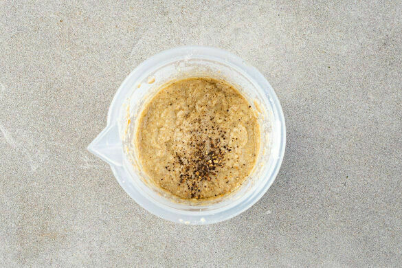 Das Trüffelöl mit 75ml Pastawasser in das Gefäß zu den Pilzen geben und mit einem Stabmixer fein pürieren. Je nach gewünschter Konsistenz ggf. esslöffelweise mehr Pastawasser zugeben, bis die Sauce cremig ist, dann mit Salz und Pfeffer abschmecken.