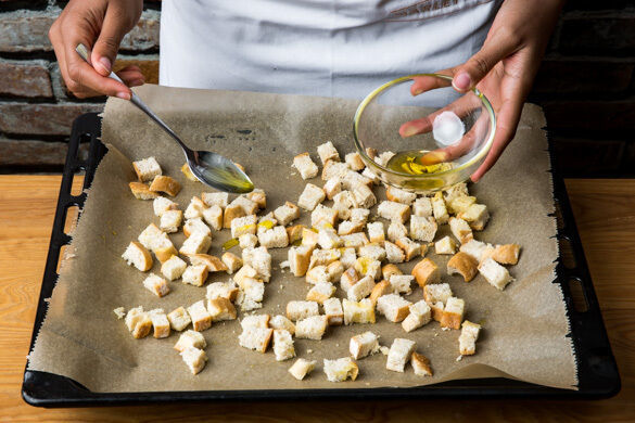 Den Backofen auf 220°C (200°C Umluft) vorheizen. Das Baguettebrötchen in ca. 0,5cm große Würfel schneiden, in 2EL Olivenöl wenden, auf einem mit Backpapier ausgelegten Backblech verteilen und 10–12Min. im Ofen rösten.