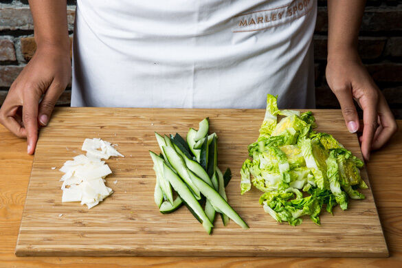 Den Salat in ca. 1cm dünne Streifen schneiden, dabei den Strunk entfernen. Die Gurke längs vierteln, das Kerngehäuse entfernen und die Gurke in schräge Scheiben schneiden. Den Käse in dünne Scheiben schneiden oder hobeln.