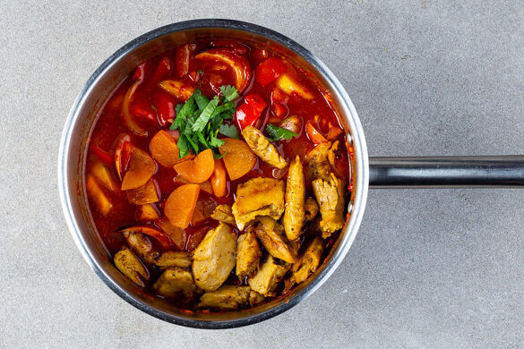 Die veganen Hähnchenschnetzel mit 300ml der Gemüsebrühe, 2/3 des Korianders und den Aprikosen zu dem Gemüse in den Topf geben und kurz aufkochen, dann bei niedriger Hitze 10–15Min. köcheln lassen. Das Ragout mit Salz und Pfeffer abschmecken.