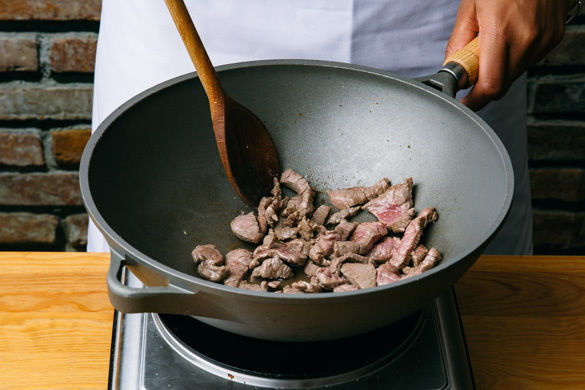 Das Fleisch trocken tupfen und in einer großen Pfanne oder einem Wok mit 2TL Pflanzenöl bei starker Hitze 1–2Min. scharf anbraten. Herausnehmen und auf einem Teller beiseitestellen.