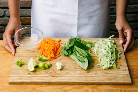 Den Knoblauch schälen und fein reiben oder durch eine Knoblauchpresse drücken. Die Karotten ggf. schälen und grob raspeln oder in dünne Stifte schneiden. Den Strunk des Pak Choi entfernen, dann den weißen Teil in dünne Streifen schneiden, die grünen Blätter längs halbieren. Die Limettenschale abreiben, 1/2 Limette auspressen, die andere Hälfte in Spalten schneiden.