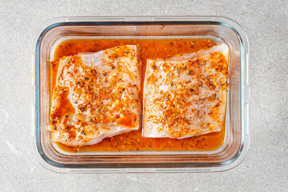 Den Fisch samt Marinade in die Pfanne geben und bei mittlerer Hitze 8–10Min. mitgaren. Tipp: Ggf. 2TL Mehl oder Stärke mit etwas kaltem Wasser vermengen und die Sauce damit andicken.