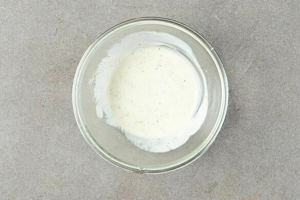 Die Schale einer Limette abreiben, dann beide Limetten halbieren und auspressen. 3EL Mayonnaise, 2EL Wasser und 1–2EL Limettensaft mit dem Limettenabrieb und je 1 kräftigen Prise Salz und Pfeffer zu einem cremigen Dressing verrühren.