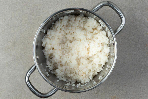 Den Ingwer ggf. schälen und in dünne Scheiben schneiden. Den Reis in einem Sieb kalt abspülen, bis das Wasser klar bleibt, dann mit dem Ingwer ins kochende Wasser geben und abgedeckt bei niedrigster Hitze 10–12Min. kochen, bis das Wasser aufgesogen und der Reis gar ist. Noch ca. 5Min. ohne Hitzezufuhr ziehen lassen.