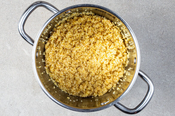 Den Knoblauch schälen, grob würfeln und in einem kleinen Topf mit 1TL Olivenöl bei mittlerer Hitze ca. 1Min. braten. Den Bulgur, das Brühgewürz, 300ml Wasser und 1 Prise Pfeffer in den Topf geben und abgedeckt zum Kochen bringen. Bei niedriger Hitze 8–10Min. sanft köcheln lassen, bis das Wasser aufgesaugt und der Bulgur gar ist. Den Topf vom Herd nehmen und abgedeckt warm halten.