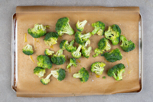Den Backofen auf 240°C (220°C Umluft) vorheizen. Den Brokkoli in mundgerechte Röschen schneiden und auf einem mit Backpapier ausgelegten Backblech mit 1EL Olivenöl und 1 kräftigen Prise Salz vermengen, dann im Ofen 12–18Min. goldbraun backen.
