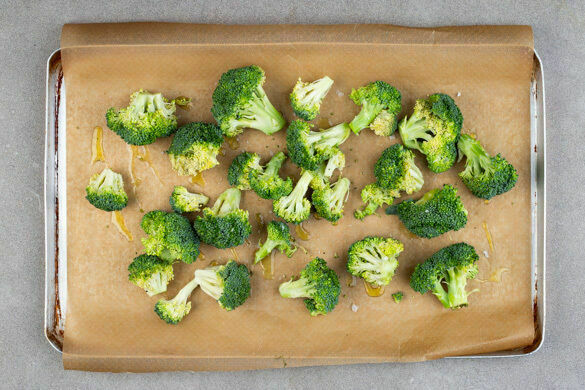 Den Backofen auf 240°C (220°C Umluft) vorheizen. Den Brokkoli in mundgerechte Röschen schneiden und auf einem mit Backpapier ausgelegten Backblech mit 2EL Olivenöl und 1/2TL Salz vermengen, dann im Ofen 12–18Min. goldbraun backen.