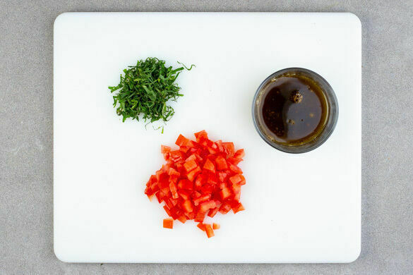 Die Tomaten in ca. 0,5cm große Würfel schneiden. Die Minzeblätter von den Stängeln zupfen und fein schneiden. Die Granatapfelmelasse mit 4EL Olivenöl, 1EL Essig und 1 kräftigen Prise Salz zu einem Dressing verrühren.