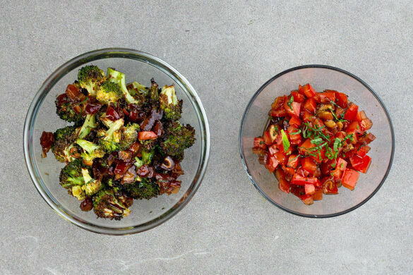 Den Brokkoli und die Datteln mit 3/4 des Dressings vermengen. Die Tomaten, die Minze und das restliche Dressing ebenfalls vermengen.