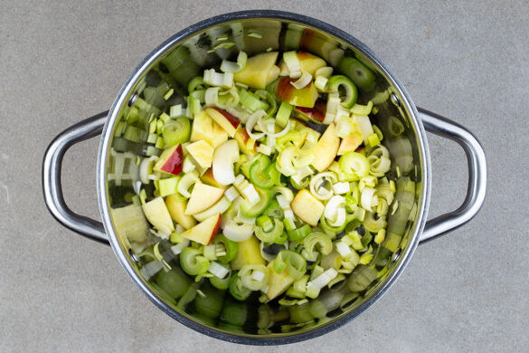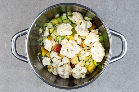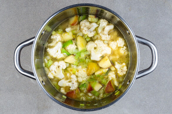 Den Knoblauch schälen und grob würfeln. Den Apfel vierteln, entkernen und in grobe Stücke schneiden. Den Blumenkohl ebenfalls in grobe Stücke schneiden. Den Lauch, den Knoblauch und die Äpfel in einem mittelgroßen Topf mit 1EL Pflanzenöl bei mittlerer bis starker Hitze 2–3Min. anbraten, dabei gelegentlich umrühren.