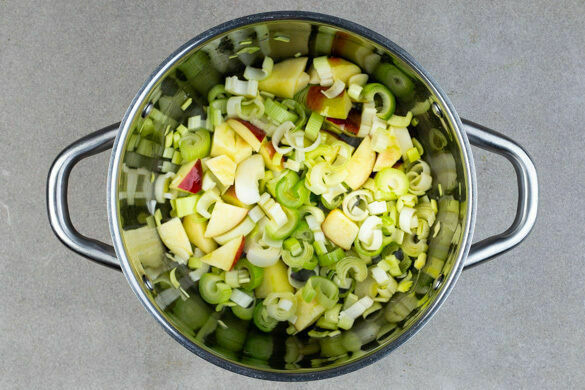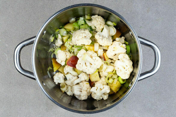 Den Knoblauch schälen und grob würfeln. Die Äpfel vierteln, entkernen und in grobe Stücke schneiden. Die Blumenkohle ebenfalls in grobe Stücke schneiden. Den Lauch, den Knoblauch und die Äpfel in einem großen Topf mit 2EL Pflanzenöl bei mittlerer bis starker Hitze 2–3Min. anbraten, dabei gelegentlich umrühren.