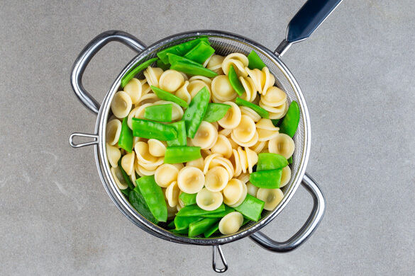 Die Kaiserschoten quer halbieren und in ein Sieb geben. Die Pasta auf die Kaiserschoten in das Sieb abgießen und abtropfen lassen.