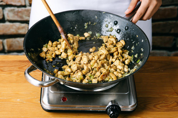 Das Fleisch trocken tupfen und in ca. 1cm große Würfel schneiden. Nach Belieben mit der Gewürzmischung und 1EL Olivenöl vermengen, dann in einer großen Pfanne oder einem Wok bei mittlerer Hitze 2–3Min. anbraten. Die Zwiebeln und den Knoblauch dazugeben und 2–3Min. mitbraten.