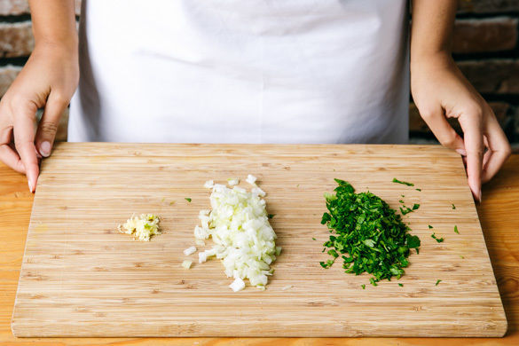 In einem mittelgroßen Topf ausreichend gesalzenes Wasser für die Pasta zum Kochen bringen. Die Zwiebel und den Knoblauch schälen, halbieren und in feine Würfel schneiden. Die Petersilie samt Stängeln fein hacken.