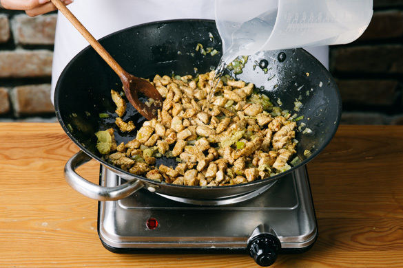 Das Fleisch trocken tupfen und in ca. 1cm große Würfel schneiden. Nach Belieben mit der Gewürzmischung und 2EL Olivenöl vermengen, dann in einer großen Pfanne oder einem Wok bei mittlerer Hitze 2–3Min. anbraten. Die Zwiebeln und den Knoblauch dazugeben und 2–3Min. mitbraten.