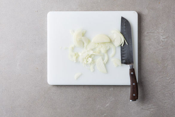 In einem mittelgroßen Topf ausreichend gesalzenes Wasser für die Nudeln zum Kochen bringen. Die Zwiebel schälen, halbieren und in feine Streifen schneiden.