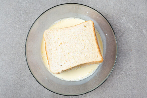 Die Toastscheiben gut in der Eiermilch wenden, etwas abtropfen lassen und auf einem Teller ablegen.