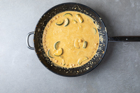 Den Knoblauch in derselben Pfanne mit 1EL Olivenöl bei mittlerer Hitze ca. 30Sek. anbraten, dann die Zucchinischeiben dazugeben und kräftig mit Salz und Pfeffer würzen. Die Zucchini 4–5Min. leicht bräunlich anbraten. Die Kichererbsen unterrühren und 1–2Min. mitbraten.
