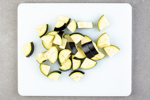 Den Backofen auf 220°C (200°C Umluft) vorheizen. Die Aubergine der Länge nach vierteln, dann quer in ca. 1cm dicke Scheiben schneiden.