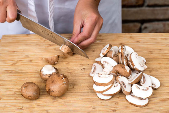 Pilze mit einer Pilzbürste oder einem Küchenpinsel säubern, das Ende des Strunkes entfernen und in dünne Scheiben schneiden. Große Pfanne mit 2EL Öl auf große Hitze erwärmen und die Champignons darin ca. 3-5Min. goldbraun anbraten, aus der Pfanne nehmen und beiseite stellen.