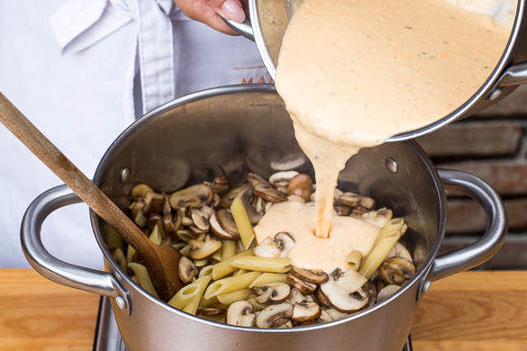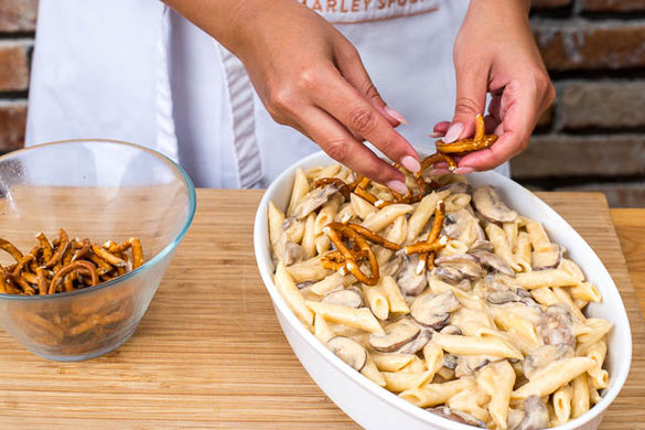 Sauce von der Herdplatte nehmen, Obazda gut untermengen, Nudeln und Champignons im Nudeltopf mit der Sauce mischen und nach Bedarf salzen und pfeffern, anschließend in eine Auflaufform geben. Aber Vorsicht beim Salz, das spätere Topping mit den Brezeln ist schon salzig.