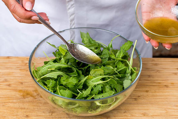 Inzwischen den Rucola in einer Schüssel mit 1-2EL Olivenöl, 1EL Essig und etwas Salz und Pfeffer würzen. Die Petersilie ohne harte Stiele grob hacken. Den Auflauf mit der Petersilie bestreuen und dazu den Salat servieren.