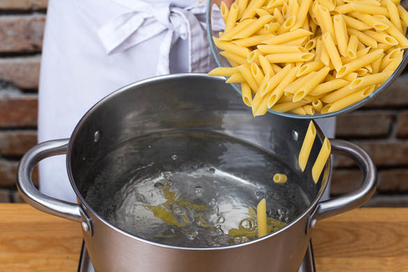 Großen Kochtopf mit ausreichend gesalzenem Wasser zum Kochen bringen und die Nudeln darin ca. 5Min. noch sehr bissfest kochen. Das Wasser ordentlich abgießen und die Nudeln beiseite stellen. Backofen auf 180°C Umluft vorheizen.