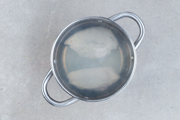 Das Fleisch trocken tupfen und jeweils längs halbieren. In einem mittelgroßen Topf mit kaltem, leicht gesalzenem Wasser bedecken. Das Wasser zum Kochen bringen und das Fleisch abgedeckt bei mittlerer Hitze 8–10Min. kochen, bis es gar ist. In ein Sieb abgießen und abtropfen lassen.