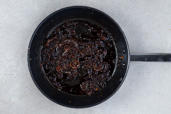 Die Zwiebeln, den Knoblauch und die Peperoni in einer großen Pfanne mit 2EL Olivenöl bei mittlerer Hitze 2–3Min. anbraten. Die Hitze reduzieren und den Ketjap Manis, 2–3EL Ketchup und 1TL Zucker unterrühren. Bei Bedarf etwas Wasser hinzufügen. Tipp: Wenn Kinder mitessen, die Peperoni weglassen und später nur das eigene Sandwich garnieren.