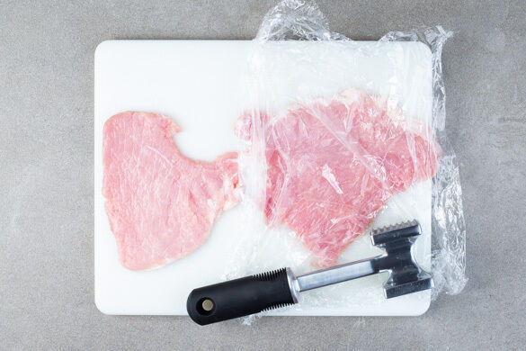 Den Backofen auf 170°C (150°C Umluft) vorheizen. Das Fleisch trocken tupfen und jeweils zwischen zwei Lagen Frischhaltefolie mit einem Fleischklopfer oder mit dem Boden einer schweren Pfanne plattieren, sodass die Steaks ca. 0,5cm dick sind. Das Fleisch von beiden Seiten mit je 1 Prise Salz und Pfeffer würzen.