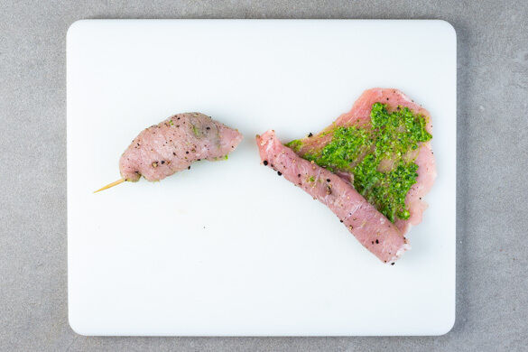 Jedes Steak mit ca. 1TL Pesto bestreichen. Das Fleisch aufrollen und mit einem Zahnstocher fixieren.