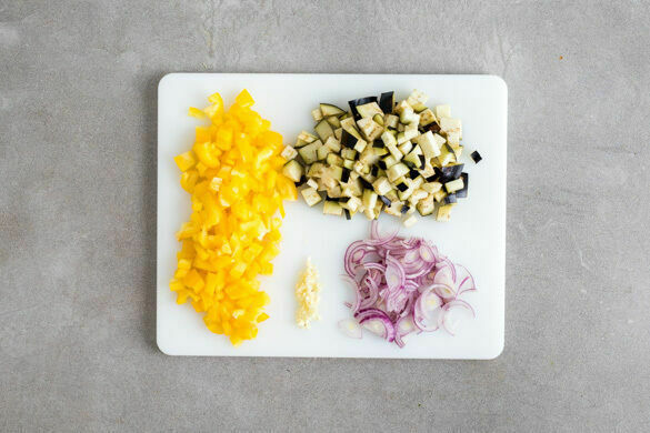 Die Zwiebeln schälen, halbieren und in feine Streifen schneiden. Den Knoblauch schälen und fein würfeln. Die Paprika vierteln, entkernen und in 1–2cm große Würfel schneiden. Die Auberginen ebenfalls in 1–2cm große Würfel schneiden.