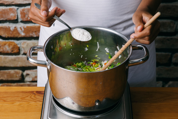 In einem großen Topf 1EL Pflanzenöl bei starker Hitze erwärmen. Den Lauch, die Zwiebeln, die Karotten und die Knoblauchscheibchen in das heiße Öl geben, mit 1EL Mehl bestäuben und 2–3Min. scharf anbraten, bis leichte Röstspuren zu sehen sind.