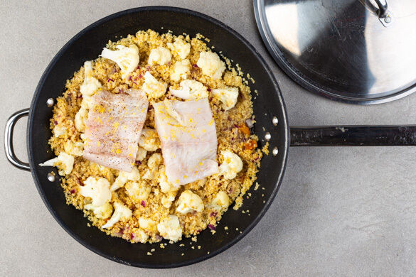 Feiner Fisch auf feinem Bulgur – müssen wir noch mehr sagen? Wahrscheinlich nicht, aber wir wollen es gerne: Heute verwöhnst du dich und deine Lieben mit einer Kreation, die die Herzen der Liebhaber duftig-leichter Aromen höherschlagen lässt. Du bettest zart-zitroniges Seehechtfilet auf lockeren Bulgur mit Blumenkohl, Karotten und Babyspinat, richtig außergewöhnlich wird es durch Aprikosen und orientalische Gewürze. Deliziös!
